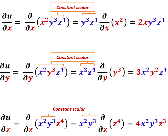 Recall that when taking the derivative of a multivariable function with respect to one variable, all other variables are treated as constant scalars.