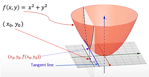 Example 3: Consider the partial derivative \(\partial f / \partial x\) of function \(f(x,y) = x^2 + y^2\) at \((x_0, y_0)\).