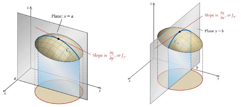 The derivative of a single variable function is the slope of the tangent line at \(x\). Similarly, a partial derivative also represents the slope of a curve on the surface of the underlying function. The following figure shows the geometry of partial derivatives.