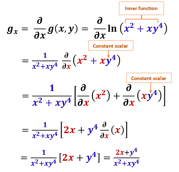Example 2: Let \(g(x,y) = \ln(x^2 + xy^4)\). Find partial derivative \(g_x(x,y)\) and \(g_y(x,y)\).