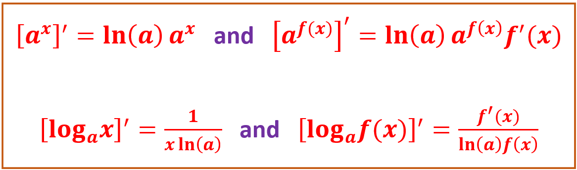 \[ \left[a^{f(x)}\right]^\prime =\left[e^{\ln(a)f(x)}\right]^\prime = e^{\ln(a)f(x)}\times [\ln(a)f(x)]^\prime =\ln(a) a^{f(x)}\times f^\prime(x) \] and