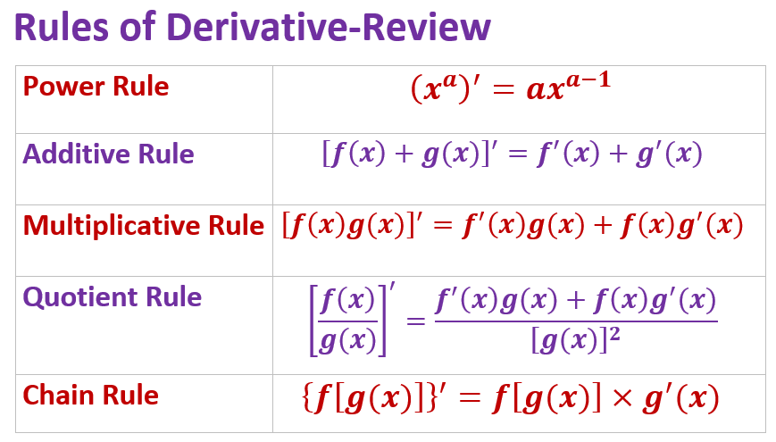We first review some concepts and properties learned in algebra and the rules of derivative we learned in the past few weeks.