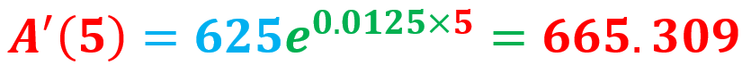 Solution: To find \(A(5)\), we simply substitute \(t = 5\) n \(A(t)\) that gives \[ A(5) = 50000e^{0.0125\times 5} \approx 53224.72. \] Note that,