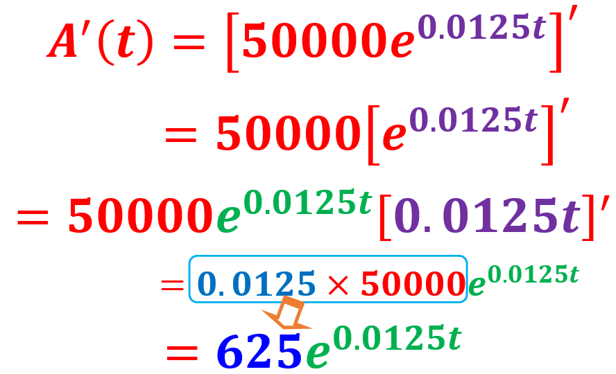 Consider the investment function in Example 4, \(A(t) = 50000e^{0.0125t}\), where \(t\) is the number of years. We also calculated the derivative \(A^\prime(t) =0.0125 \times 5000e^{0.0125t}\).