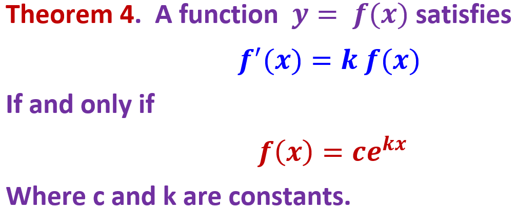 Observe that \(A^\prime(t)\) and \(A(t)\) have a direct relationship: \(A^\prime(t) = 0.0125A(t)\). In general, if a function \(y = f(x)\) that \(f^\prime(x) = k f(x)\) (\(k\) is a constant), we call it the exponential growth model. We formalized this observation in the following theorem (without proving it)