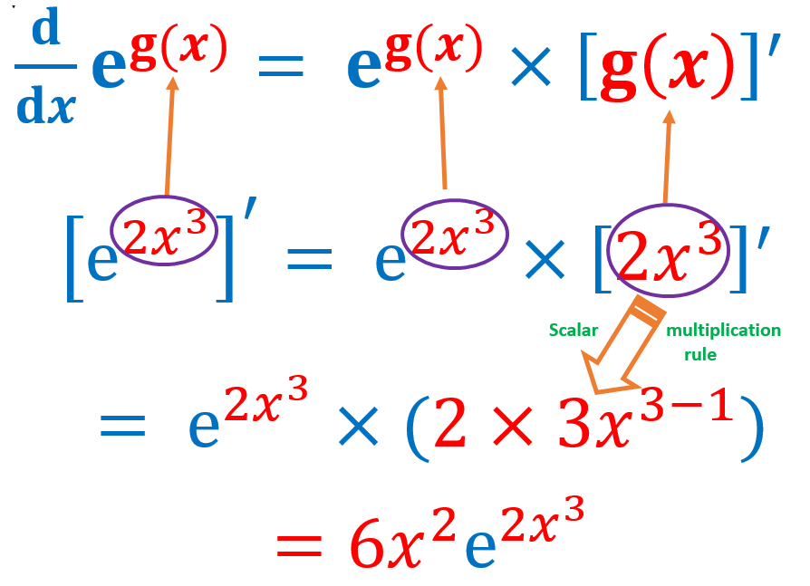 The above theorem is essentially an application of the chain rule to the general natural base exponential function. The following figure illustrated the use of the above theorem with an example.