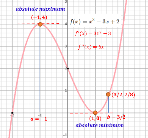 Example 2: Find the absolute maximum and absolute minimum values of \[ f(x) = x^3 - 3x + 2 \]