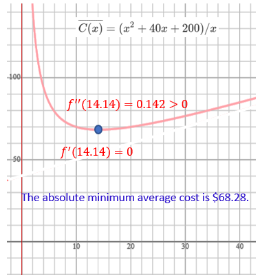 \[ [\overline{C(14.12)}]^{\prime\prime} = 400\times 14.12^{-3} \approx 0.142 > 0. \] Therefore \(\overline{C(x)}\) is concave down. The minimum average cost is