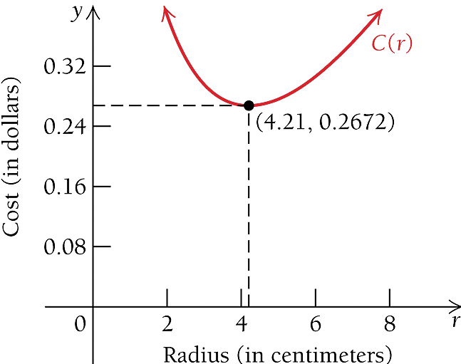 Step 4: Since \(C^{\prime\prime}(4.21) = 0.0032\pi + 1.5\times 4.21^{-3} \approx 0.03015536 > 0\), the cost function achieves it minimum at \(r = 4.21\). The minimum cost is