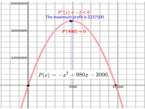 C). We need the first and second-order derivatives to find the critical value(s) and the concavity of \(P(x)\). \[ P^\prime(x) = [-x^2 + 980x - 3000]^\prime = -2x + 980 \] Setting \(P^\prime(x) = 0\), we have \(-2x + 980 = 0\) which gives \(x = 490\). Note that \(P^{\prime\prime}(x) = (-20x + 980)^\prime = -2 < 0\). The profit achieves its maximum when producing \(x = 490\) items.