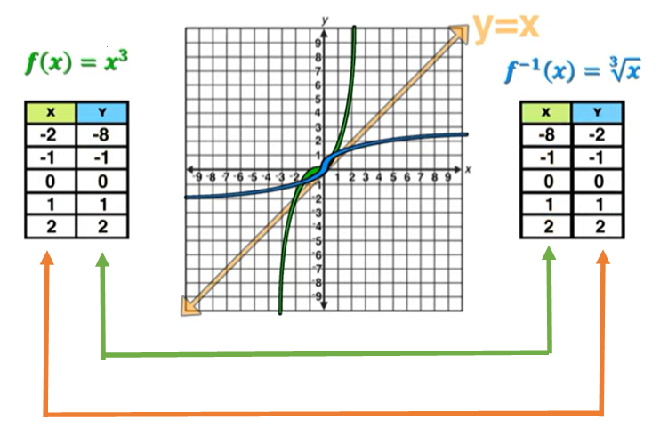 The above table and figure basically show that we swap x- and y-coordinates of one function to get its inverse and the corresponding curves are symmetric with respect to \(y = x\), the diagonal of the first and third quadrants.